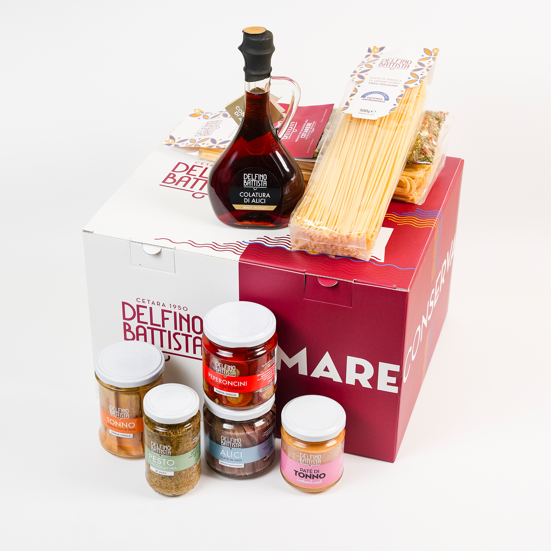 Scopri la selezione gourmet Delfino Battista con il meglio della tradizione di Cetara: colatura di alici premium, filetti di tonno pinna gialla, pesto con alici e tanto altro, in una elegante box regalo ideale per Natale e occasioni speciali.52,00 €