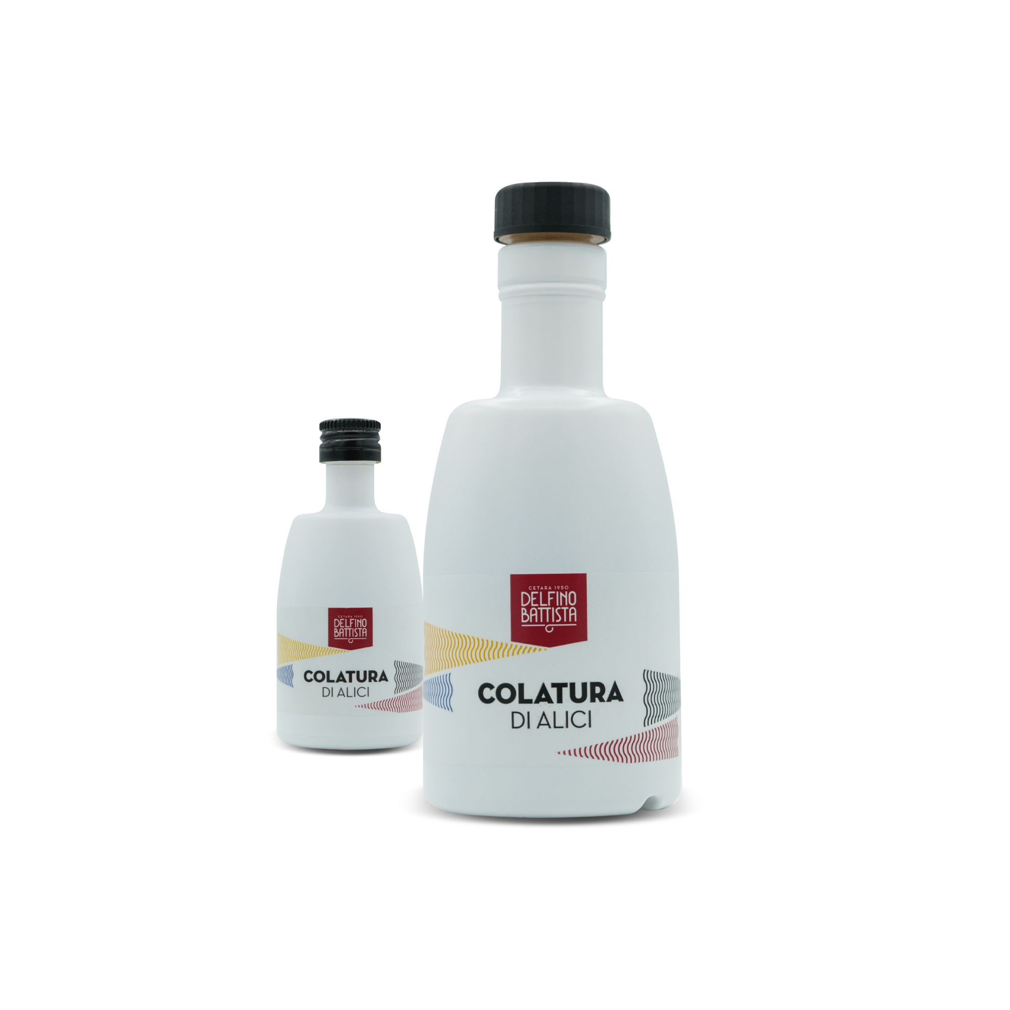 La colatura di alici prodotta con il metodo tradizionale, nella caratteristica bottiglia della linea riserva Delfino Battista.