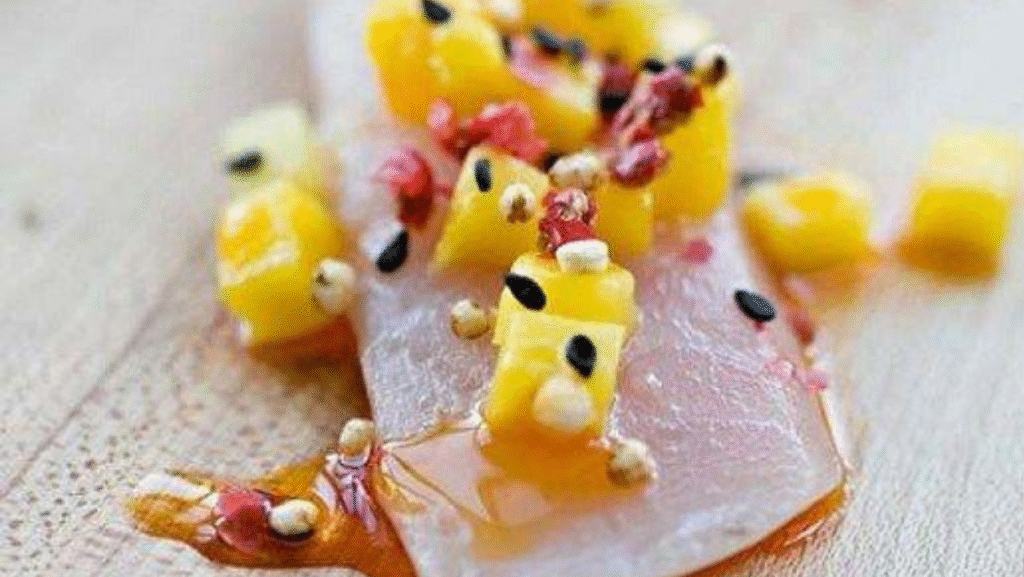 Crudo di ricciola, mango fresco, vinaigrette con aceto di mele, miele d’arancio e colatura di alici
