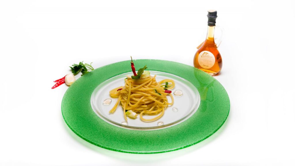 Spaghetti con datterino giallo, alici fresche, granella di pistacchi e colatura di alici Delfino Battista